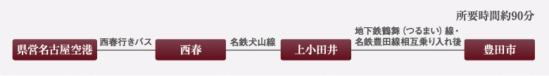 空路 中部国際空港(セントレア)からお越しの場合 高速バス〔直通〕 中部国際空港より「豊田市」行にご乗車下さいませ 豊田市では、名鉄豊田市駅前の【名鉄トヨタホテル様前】(当ホテルより徒歩約4分)着になります 私鉄 名鉄中部国際空港線〔乗換2回〕 県営名古屋空港(旧名古屋空港)からお越しの場合 西春(にしはる)行バスにご乗車 終点の西春で下車(所要時間約15分) ↓ 上小田井まで普通電車に乗られ、上小田井より豊田市行にご乗車 (上記の豊田市行の電車は、名鉄―名古屋市営地下鉄―名鉄と相互の乗入れ)