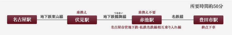 When taking the mutual entry line of the Nagoya municipal subway lines and the private railroad Meitetsu Toyota lines (One transfer is necessary.)