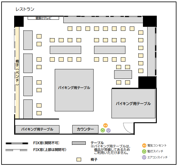 朝食用のバイキング用テーブルが室内にあり、什器が置いてあります。机と椅子の大幅な移動はできません。