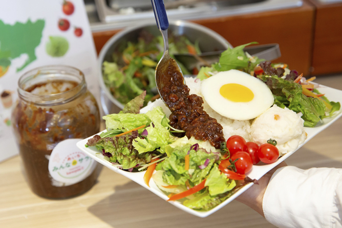 サラダバーのレタス・水菜・ニンジン・パプリカ・紫キャベツ・レッドオニオン・カイワレ大根・ミニトマトなどの季節の野菜に手造りの肉味噌をかけた「サラダめし」をメニューに採用しました。