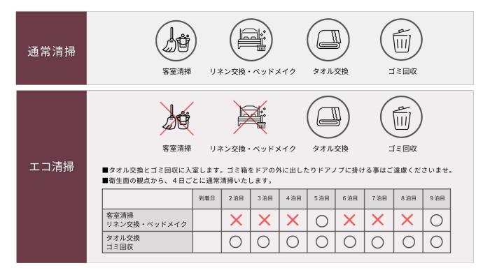 連泊のお客様にはチェックイン時、「通常清掃」か「エコ清掃」を選んでいただきます。