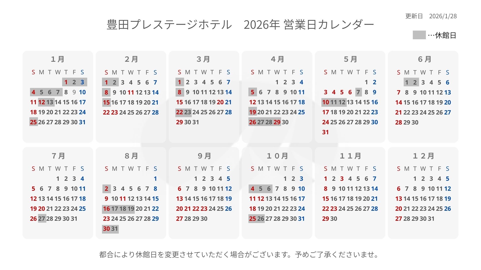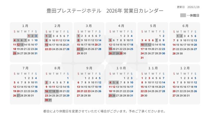 休館日のお知らせ(2026年) 2025年12月30日(火) お知らせ いつも当ホテルをご利用いただき誠にありがとうございます。 誠に勝手ながら、館内メンテナンスと従業員の休日確保のため、以下の日程で休館させていただきます。 休館中にいただいたメール等のお問い合わせは、営業再開次第、順に返信させていただきます。 ご不便をおかけいたしますが、ご理解のほどよろしくお願い申し上げます。