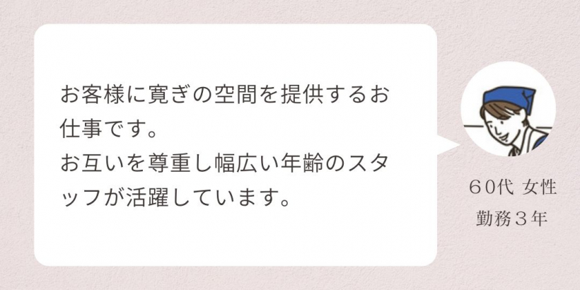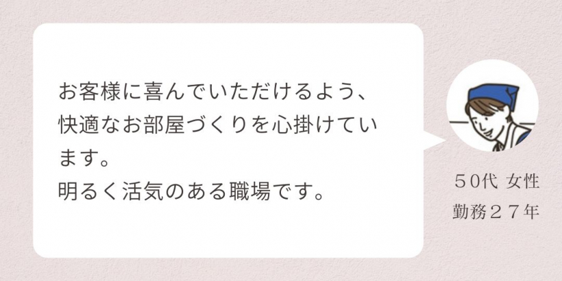ハウスキーパー(客室清掃) 業務内容 客室の清掃およびベッドメイキング、館内の清掃 など 時 給 時給1,100円〜 ※研修期間あり 時間 9:00~15:00(休憩あり) ※お客様のご都合により出勤時間の繰り上げ繰り下げあり ※清掃するお部屋数により終了時間が変動 ※勤務時間は応相談 待 遇 ・交通費別途一部支給 ・制服貸与 スタッフの声 ご応募について ご応募は、以下メールフォームまたはお電話にてお気軽にお問合せください。 ご応募はこちら <お問い合わせ先> TEL: 0565−34-6047(採用専用) ※お電話でのお問い合わせは、11:00〜15:00までとさせていただきます。