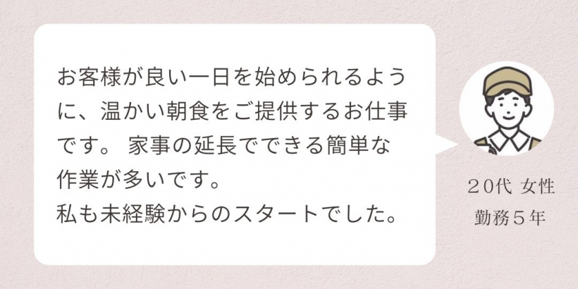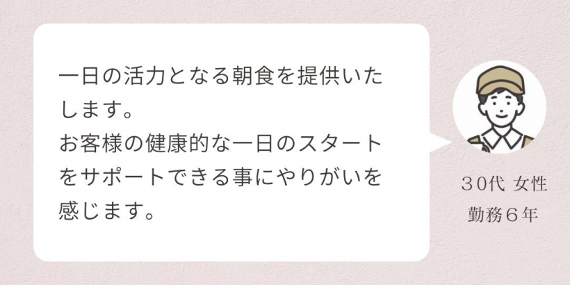 主に朝食の時間帯ですが、月に1・2回程度、夕食や昼食の勤務もあります。夕食や昼食の勤務が可能な方を優遇いたします。